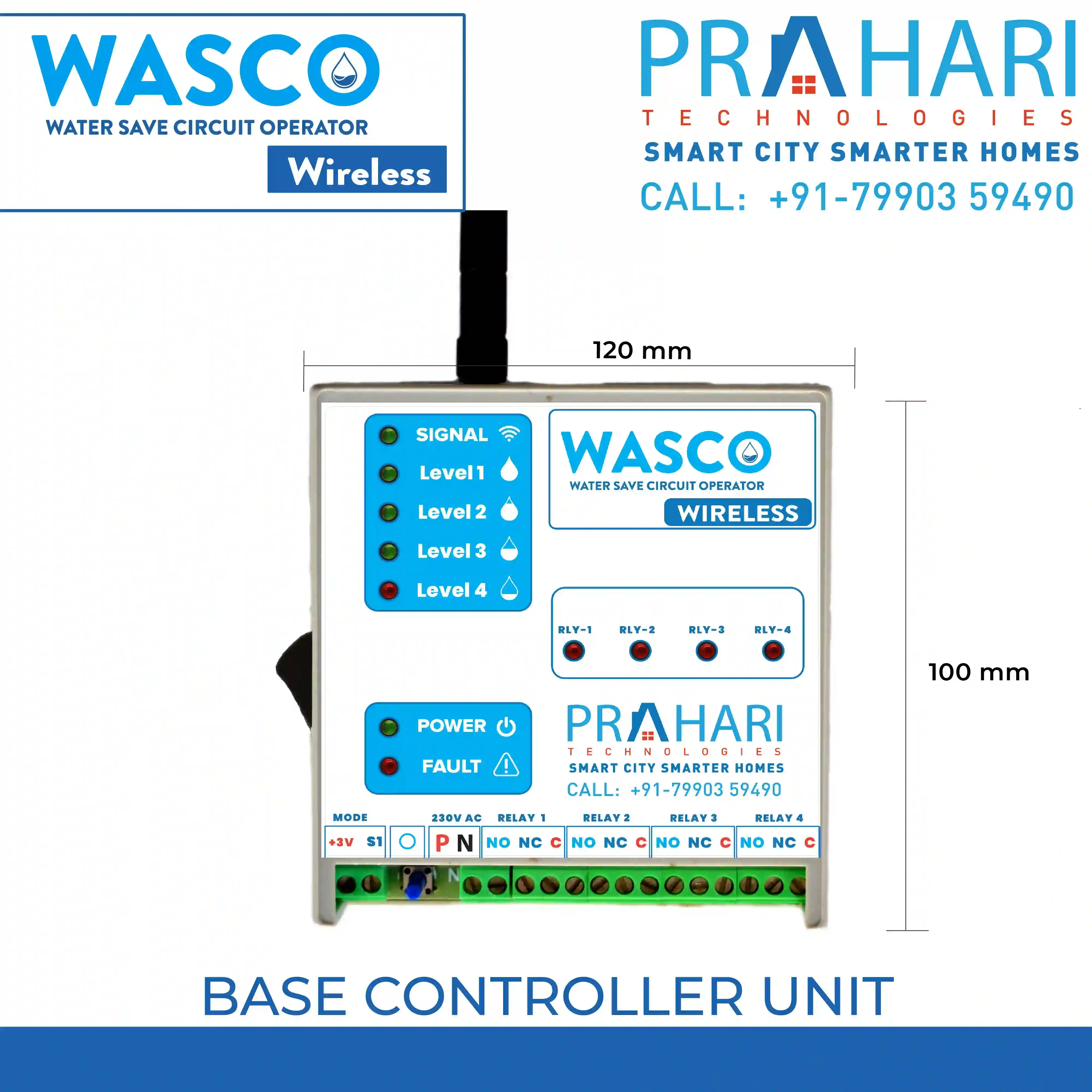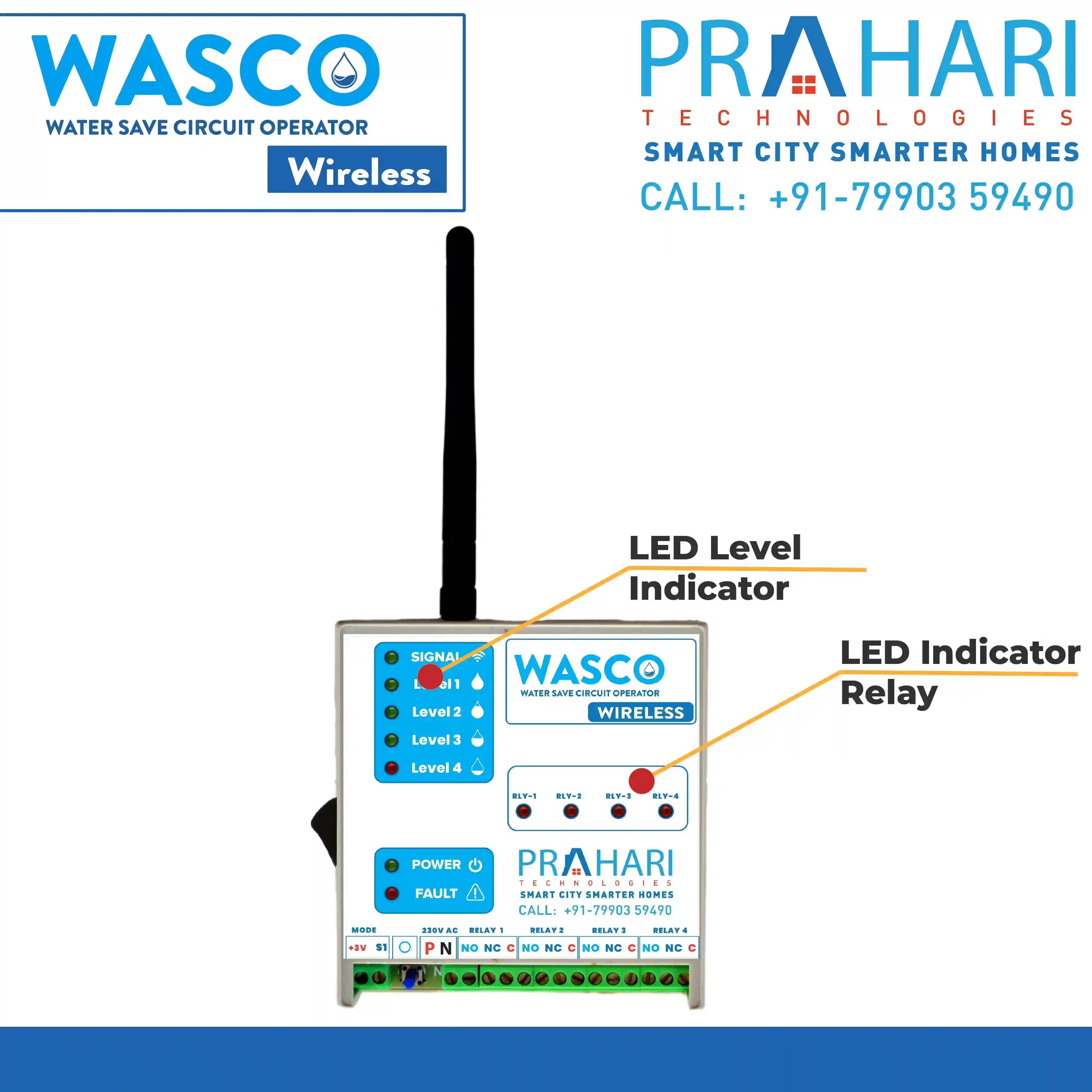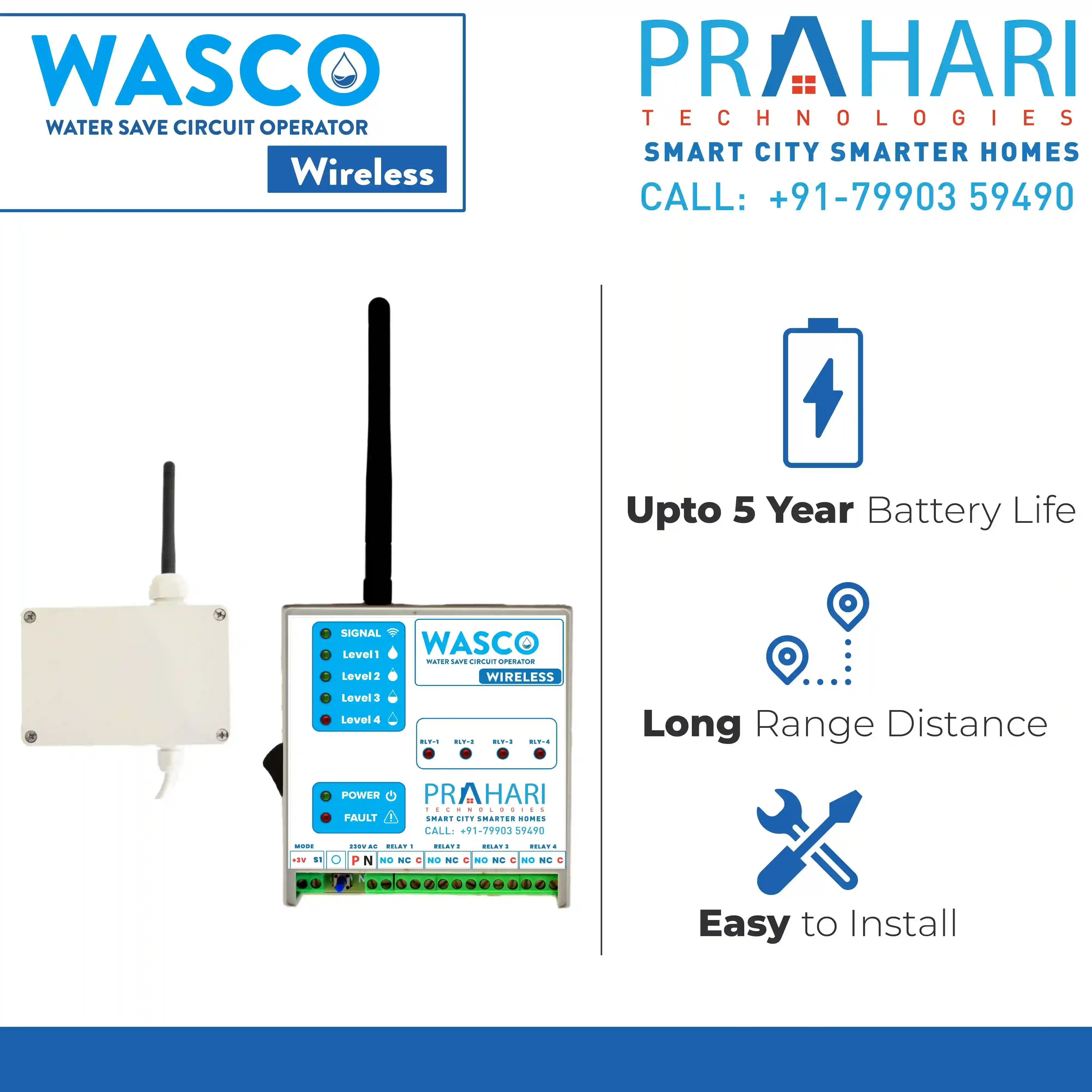Wasco Stands for Water Saving Circuit Operator.Wasco Wire Mini is the simplest Basic water level Controller.It is the most economical and energy efficient product from Prahari Technologies. The water level controller can switch ON or switch OFF the pump, to maintain the pre defined water level at the storage or overhead tanks.Low AC Voltage sensing circuit to avoid polarization of electrodes in water. These special stainless steel plastic molded conductive electrodes are Long life sensors and do not require frequent cleaning or replacement.This Water level controllers Indicator is highly recommended for metro cities or areas where drinking water is supplied through pipelines which are further distributed in homes, hotels, societies etc.At large our systems not only help you but your neighbors and society, also as it reduces the wastage of water by cutting down any further overflow than what you need. It also Saves You Time by not waiting to switch off motor and Money by saving electricity. It also saves your motor by dry run protection.